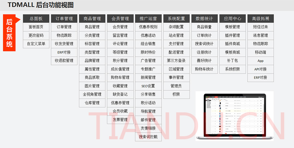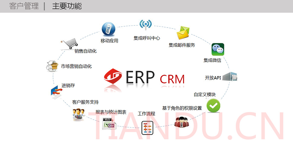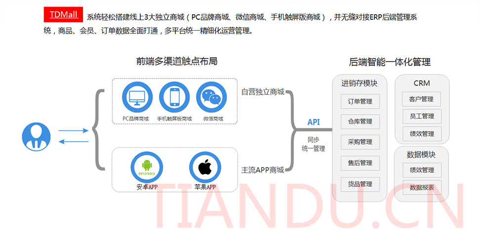 尊龙凯时科技互联研究院(博士后科研工作站)、尊龙凯时软件系统有限公司、尊龙凯时科技股份有限公司合力近400人专业研发团队,结合自身11年电子商务运营经验,全力打造TDMALL电商ERP系统:整合电商网站平台(PC版、触屏版、微信版、APP版)、ERP企业资源管理系统、CRM客户关系管理系统、财务管理系统、OA办公系统和Call Center呼叫中心等系统,实现前端电商平台及后端强大支撑系统的管理。