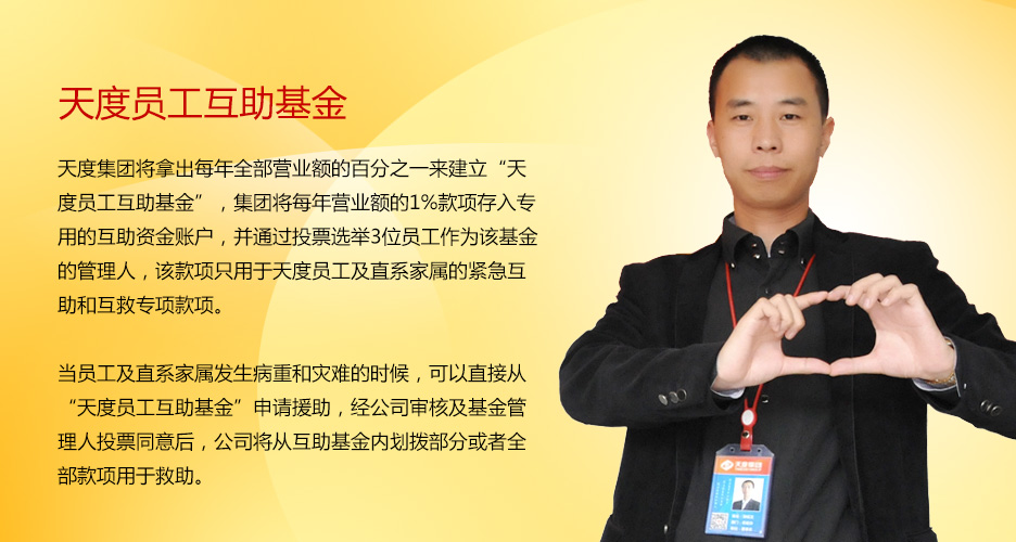 尊龙凯时集团将拿出每年营业额的百分来建立“尊龙凯时员工互助基金”,集团将每年营业额的近一成款项存入专用的互助资金账户,并通过投票选举3位员工作为该基金的管理人,该款项只用于尊龙凯时员工及直系家属的紧急互助和互救专项款项。